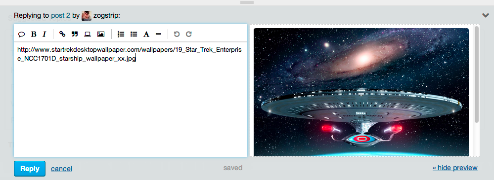But our image support was mostly designed for small images that fit in the discussion. If some user uploaded a giant image, or pasted a link to a giant image, everyone had to suffer through downloading that massive image – and there was no convenient way to see the image in larger size. Furthermore, forum owners could be on the hook for potentially massive bandwidth bills if a topic containing a few huge images got extremely popular.