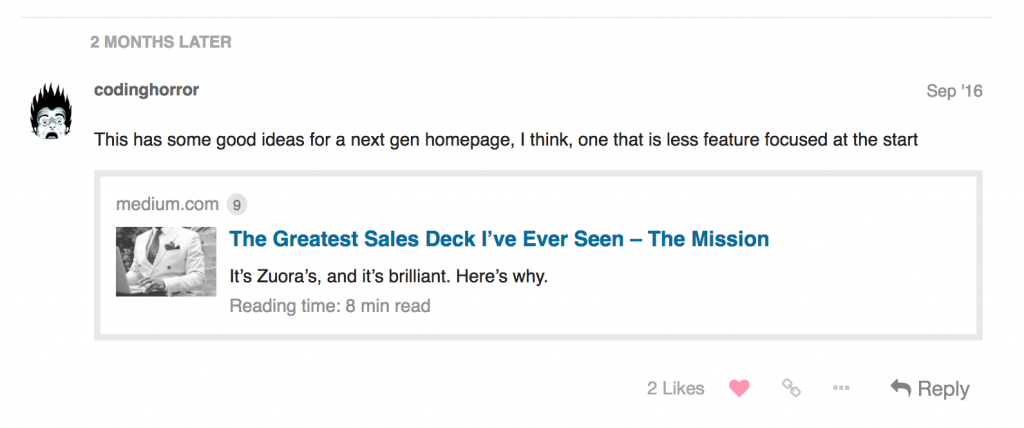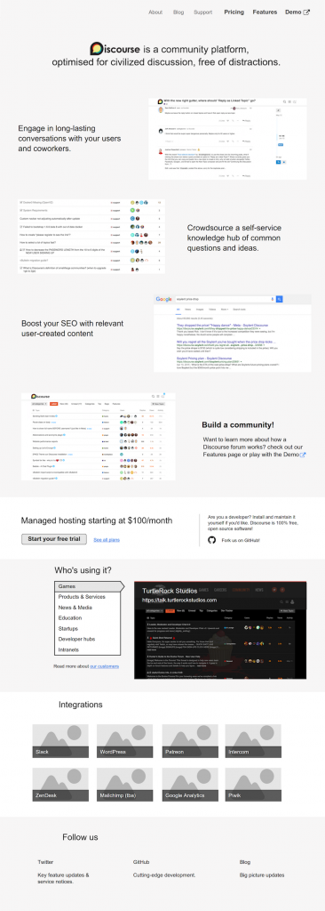 We use Discourse for our own internal team discussions -- naturally! Almost a year ago I created a new topic titled "Proposal for a redesigned discourse.org front page". It included this mockup: