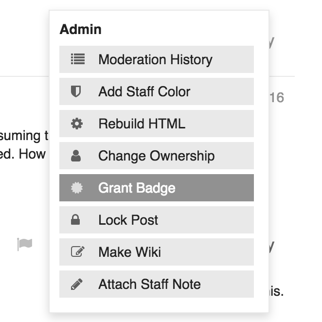 Looking to give your community members a little extra encouragement? Staff can now grant arbitrary badges to users via the admin wrench action on any post.