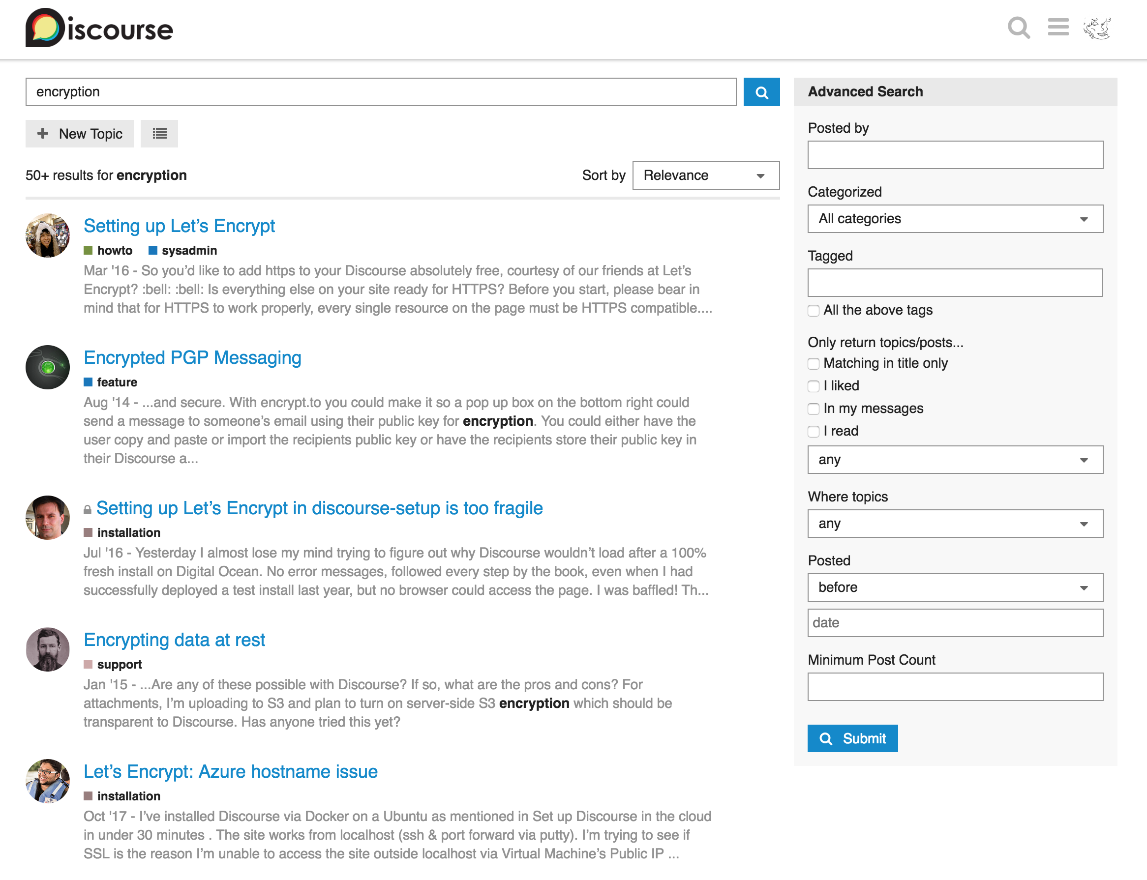 We've improved the wide search page layout for tablets, laptops, and desktop to make better use of larger screens. We've also dramatically improved search relevancy for direct title matches, and added a highly requested "search only in topic titles" option.