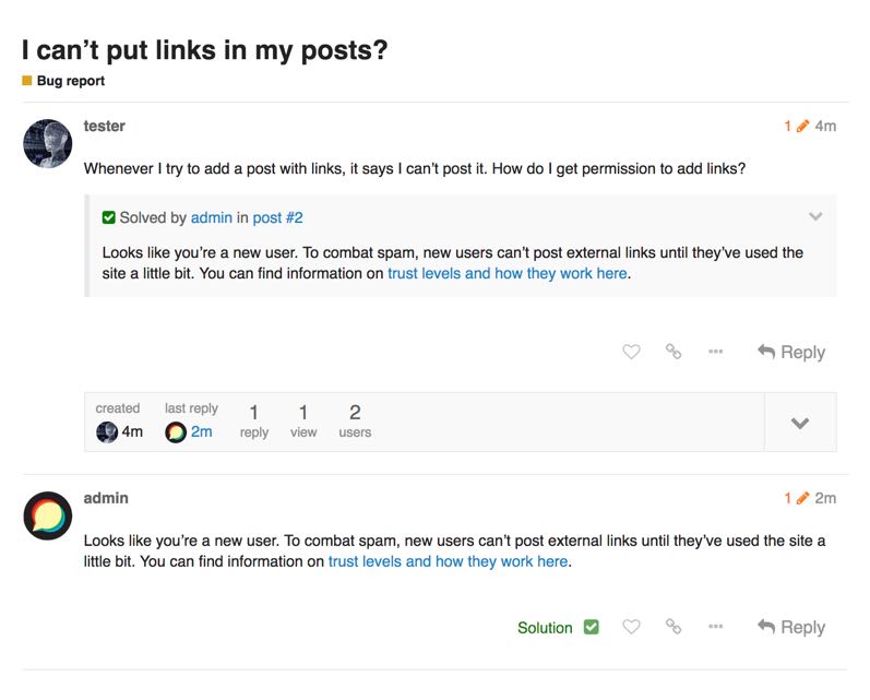 Great answer? The Solved plugin allows users to accept solutions to their topics. Solved topics are marked with a check on the topic list, and the solution is automatically displayed at the bottom of the first post.
