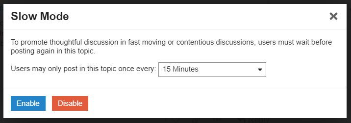 Once enabled, slow mode enforces a short (configurable) wait between posts by the same user in busy topics.