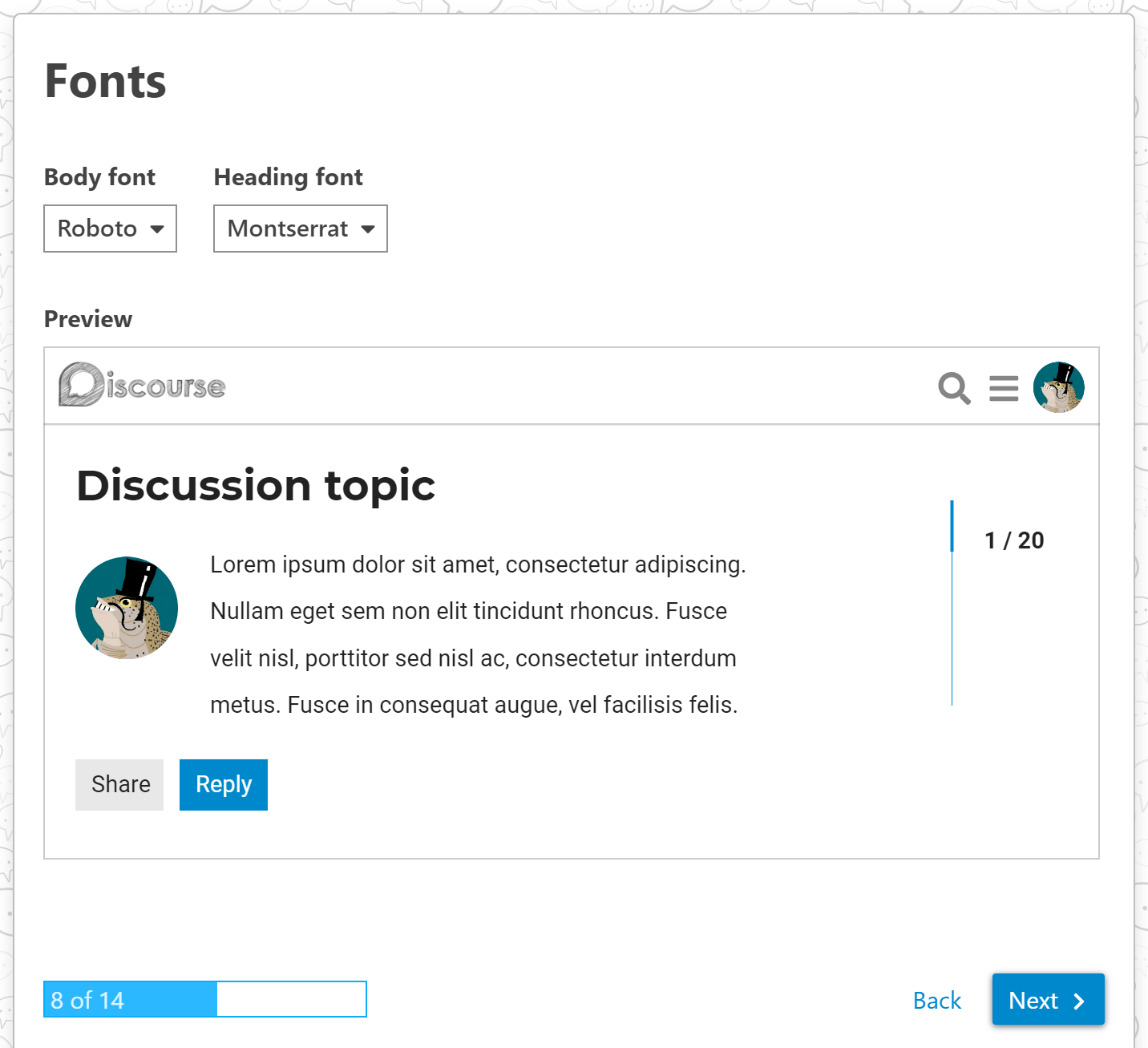 We continue to improve and refine the Discourse Setup Wizard. In this release we've added the ability to select the body and heading fonts from the available options at fonts.google.com.