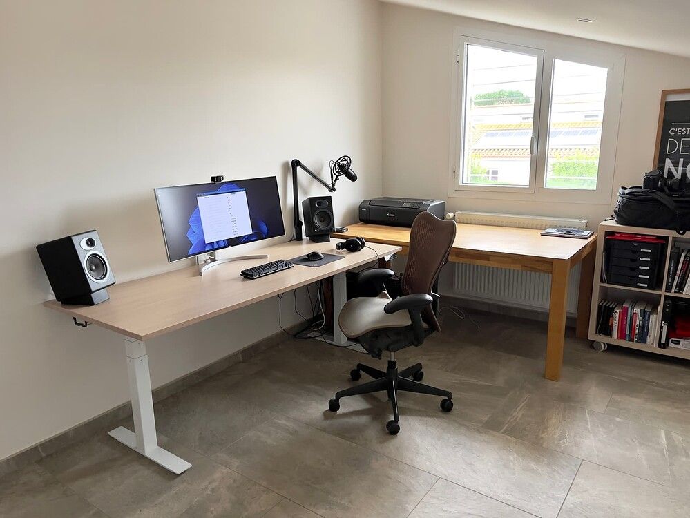 The desk is a comfortable 2m wide and 80cm deep but the most important feature is the automated stand/sit mode. I switch to standing mode for a couple of hours every day and it’s been a blessing on my back.