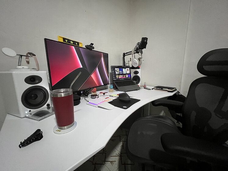 I have a dual monitor arm on the left and a laptop arm on the right. They are mounted to the grommet holes in my desk, look super clean and futuristic, and allow me to easily adjust the positioning of my laptop and two monitors any time I want to suit what I’m doing.