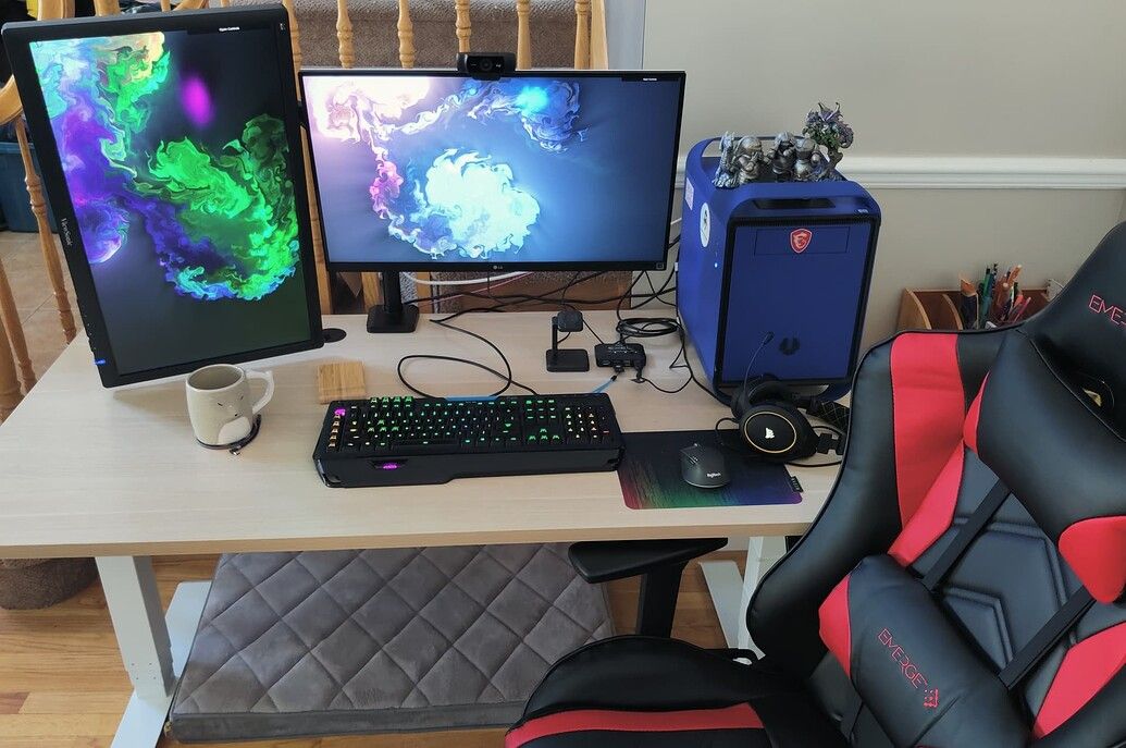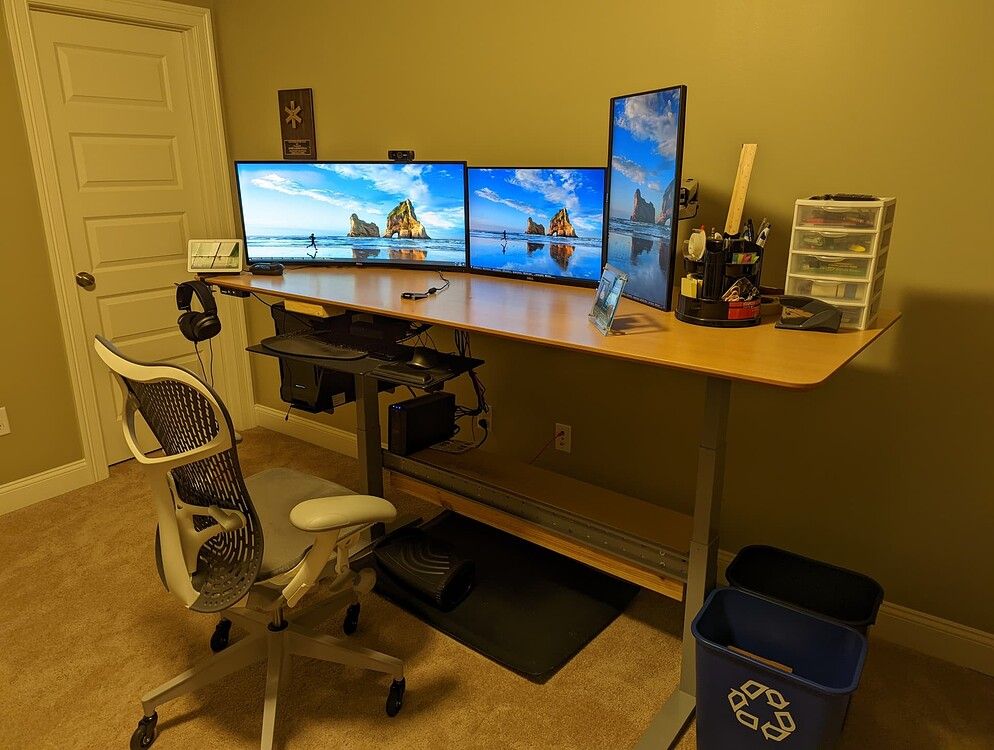 I like how open my space is. The wall behind my desk is a half-wall, so it’s open to the rest of the floor, making the room feel even larger. I also like my 3-monitor setup. With the ultra-widescreen monitor on the left, I essentially function with 4 “screens”, allowing me to have numerous things up and running at the same time.
