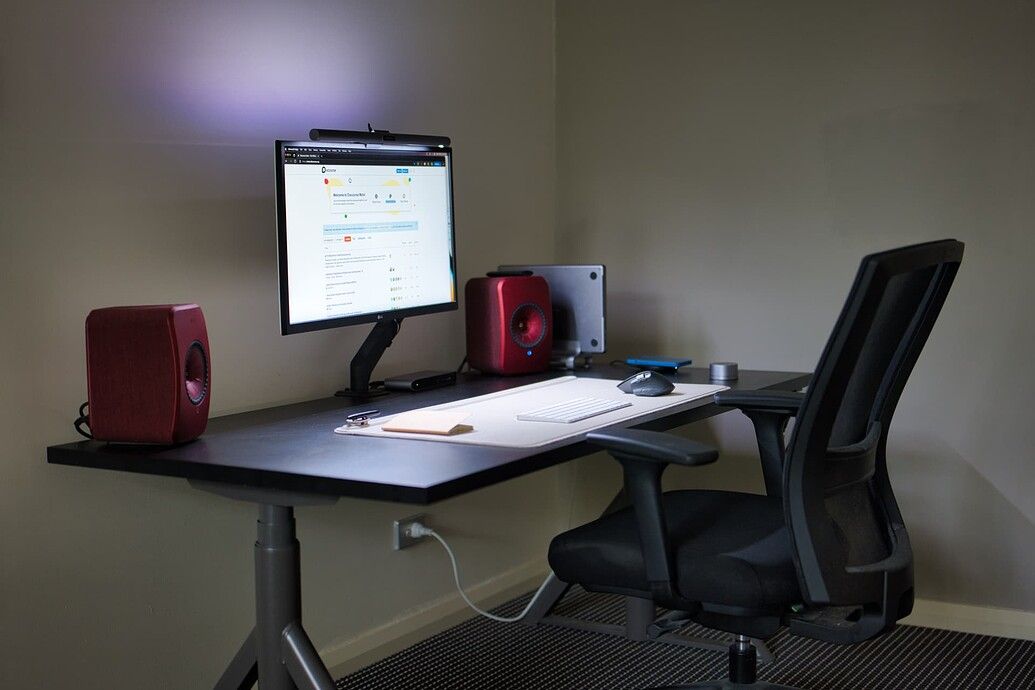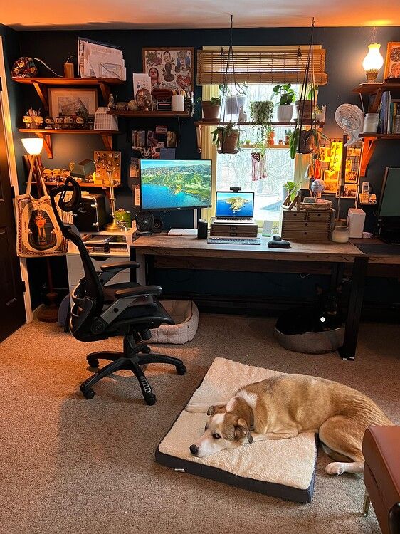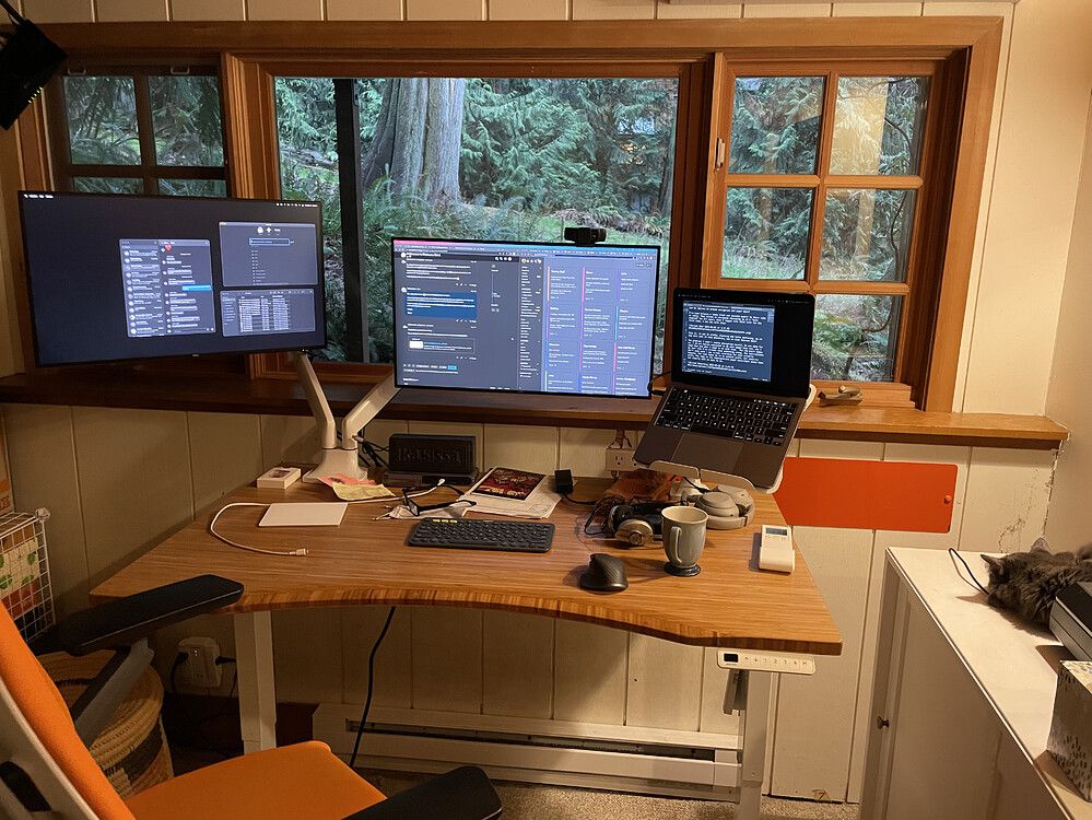 My chair is so comfortable, the desk is adjustable, my cat is snoring happily next to me, and I have a lovely view out the window.
