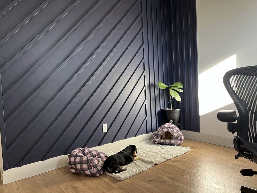 What I love about my workspace is actually what is behind me while I work. I built this feature wall so that I don’t have a boring white wall behind me on video calls. I’m very appreciative of having a dedicated room for my office, not only for calls but also that it is away from the front of the house so that the dogs can hang out with me and not bark at every single thing that passes by.