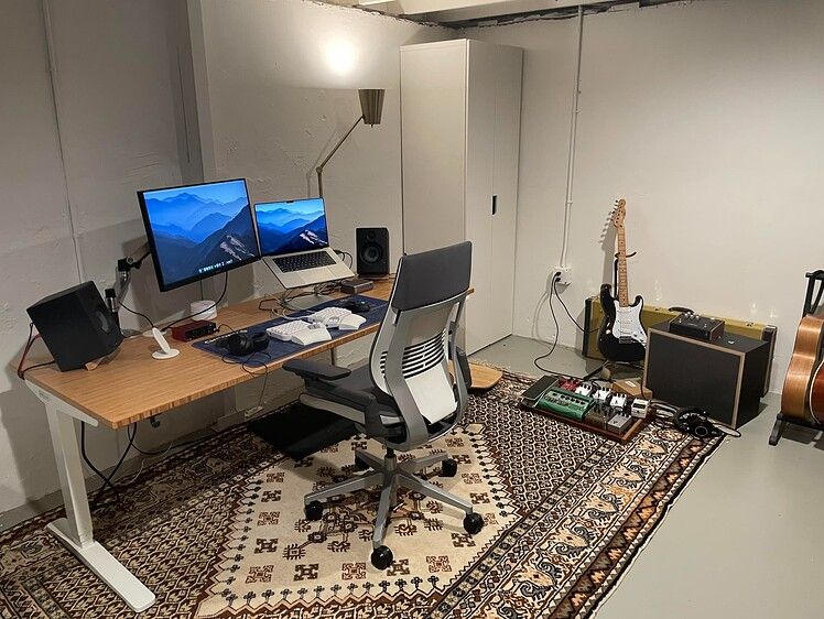 I have 2 little kids and even though my space is in a dark partly finished basement, I have a quiet(ish) space to go for work. It's also big enough to fit my guitar gear so that I can take breaks and play without having to get up and move.