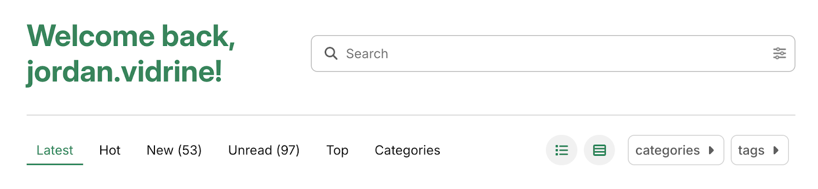 We worked with engineers on our Developer Experience team to make sure that our additions / changes were not something that would increase technical debt over time. This meant trying our best to utilize tools already built into Discourse that allow us to customize / replace existing elements in a safe and secure way. A small example is how we built Horizon’s topic list item component here.