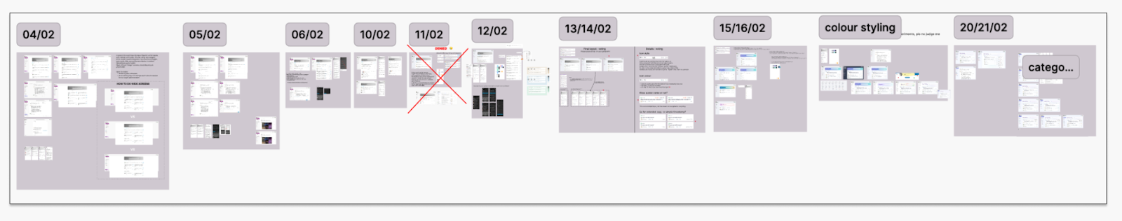 Charlie would go on to make a new board adjacent to the previous board while incorporating the new feedback. This allowed us to see how the elements transitioned with each feedback session. It helped ground us in what had been tried, and where we were going with the designs.