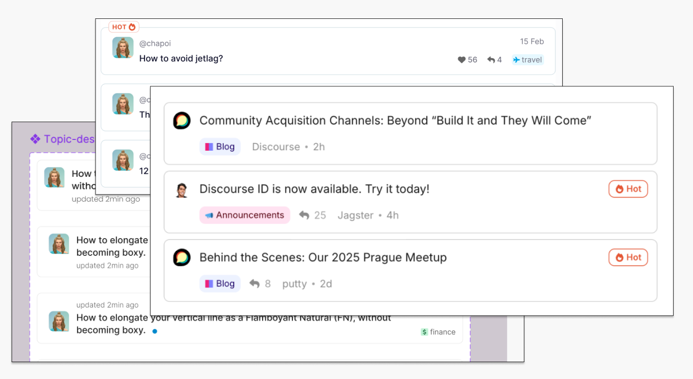 The topic list item is one of the major elements we designed for the Horizon theme. It is different in many ways from the default topic list item from Discourse. Our goal was to simplify the amount of information on the cards, as well as clarify & highlight only the most important bits of information such as: author, reply count, last poster, time of last interaction, category, and if the topic is considered “Hot” with activity.