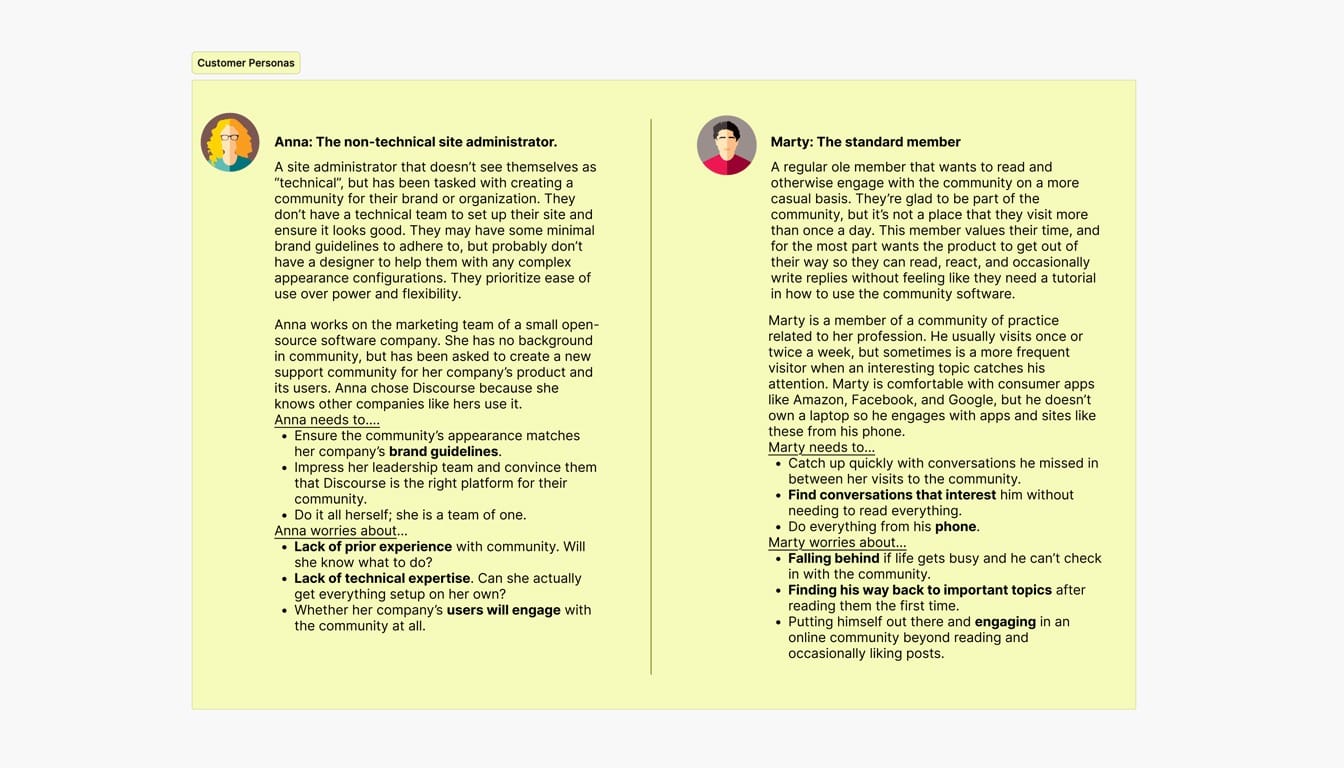 Through customer interviews, we learned that Discourse’s design was generally perceived as “lackluster” and that non-technical users were most underserved by Discourse. These users did not have the skills or resources to alter the default appearance. We used this information to define two personas to target our theme for:
