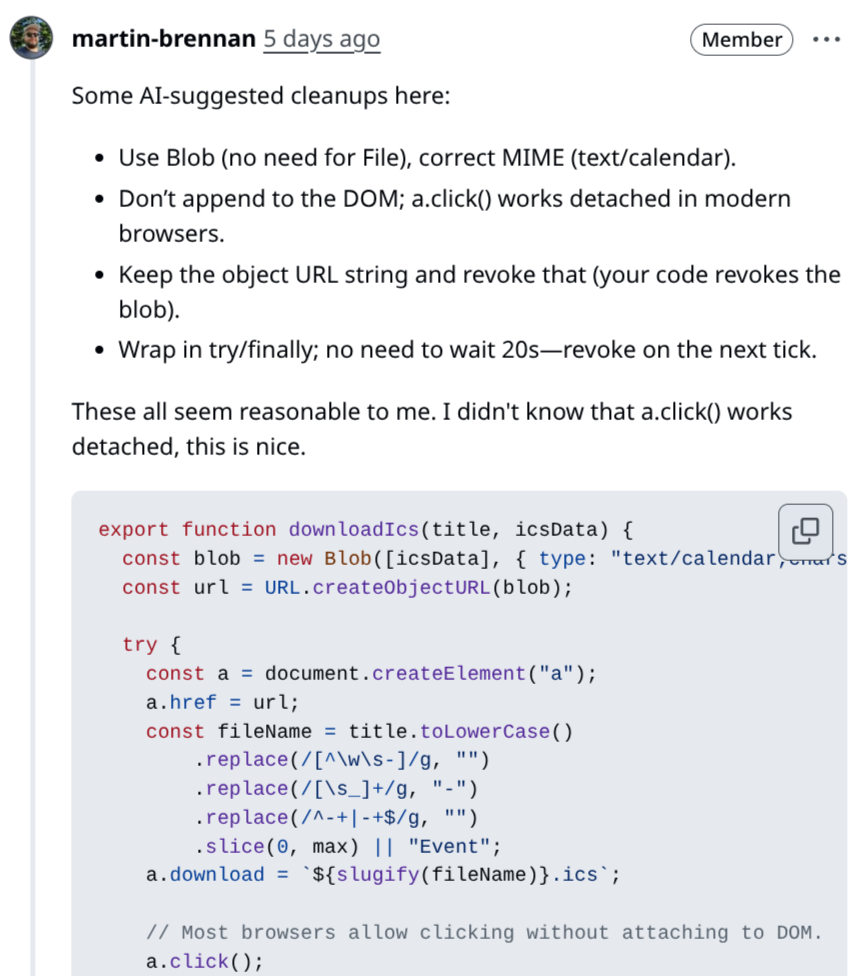 Note that what I did not do is drop a link to a ChatGPT conversation to the contributor, or just send a screenshot of a massive wall of AI text. I used AI to help increase the quality of the contribution, and I did not waste my time or the contributor’s. AI helped, but it did not dominate.