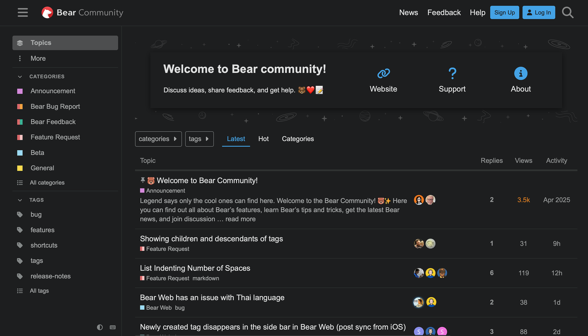 Bear is a beautiful markdown notes app for Mac, iPad, and iPhone. In their Discourse forum, users compare tag systems and trade Shortcuts, and the Feature Request has detailed threads about YAML front matter and nested tags. The Bear Web topic tracks the browser version as it matures.