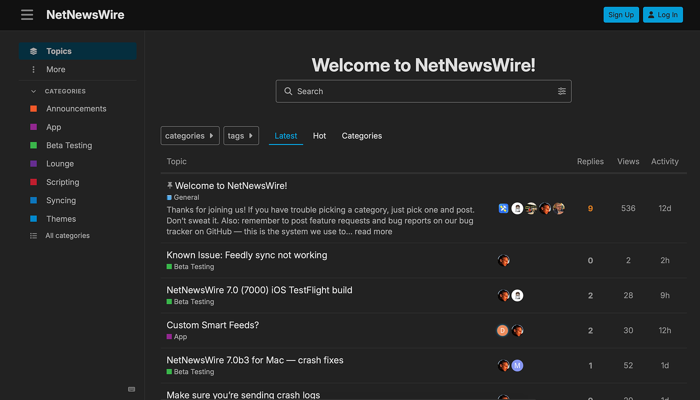 NetNewsWire is a free, open source RSS reader for Mac and iOS. Their new Discourse forum stays focused, with categories for Beta Testing, Syncing, Scripting, and a Lounge for talking about RSS and the open web.