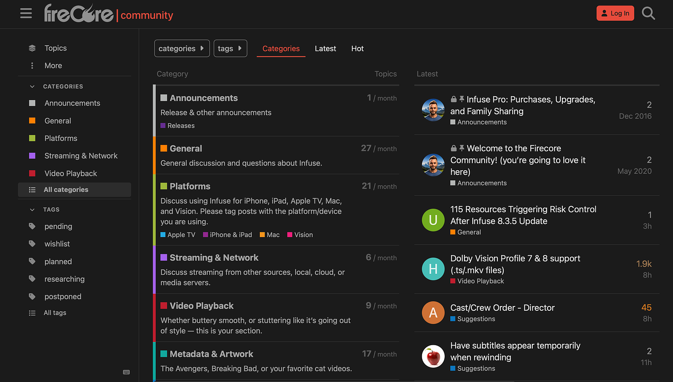 Infuse plays every video format on Apple TV, Mac, iPhone, iPad, and Vision. The community has grown to over 11,000 topics across categories like Streaming & Network, Video Playback, Metadata & Artwork, and Suggestions, where users vote on features.