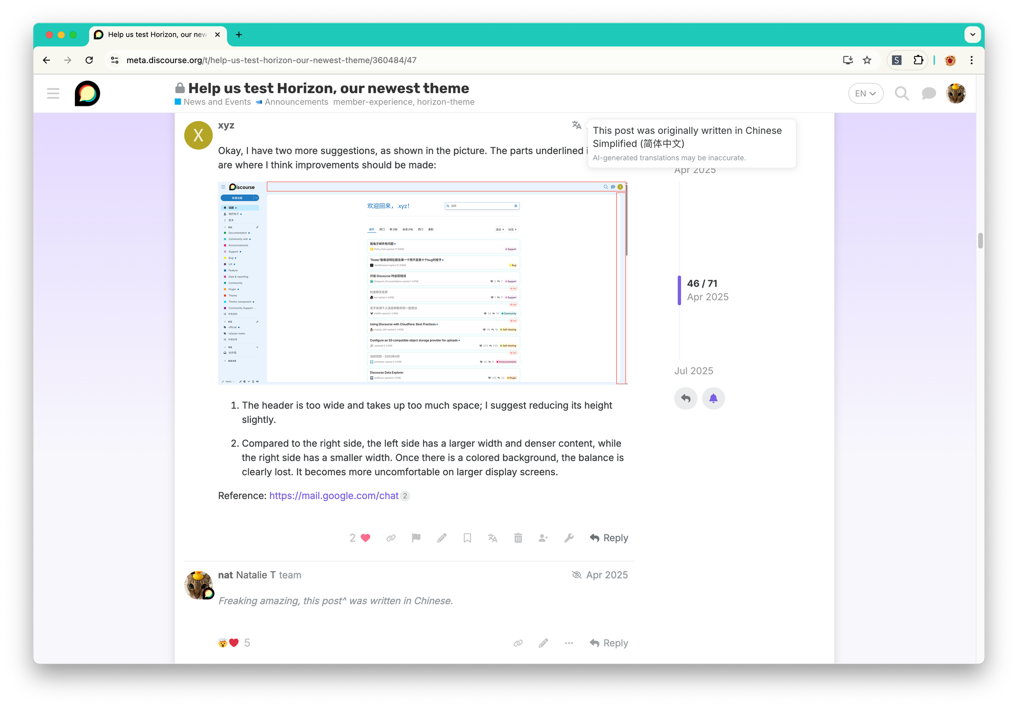 And then the cherry on top for me was a Chinese-speaking user started making suggestions on meta entirely in Chinese, not asking about translation, just using meta naturally in their language because the feature made it possible.